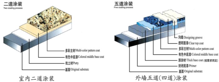 產品配套說明 A、平面:墻體處理/外墻專用膩子一底涂/水性外墻抗堿封閉底漆(透明)一中底涂/水性外墻有色底漆(調色)—中涂/水性多彩崗巖漆主材一面涂/水性透明面漆 B、拉花面、琺瑯面、粗礦面:墻體處理/外墻專用膩子一底涂/水性外墻抗堿封閉底漆(透明)—中底涂/水性外墻有色底漆(調色)—中涂/水性多彩崗巖漆主材—面涂/水性透明面漆